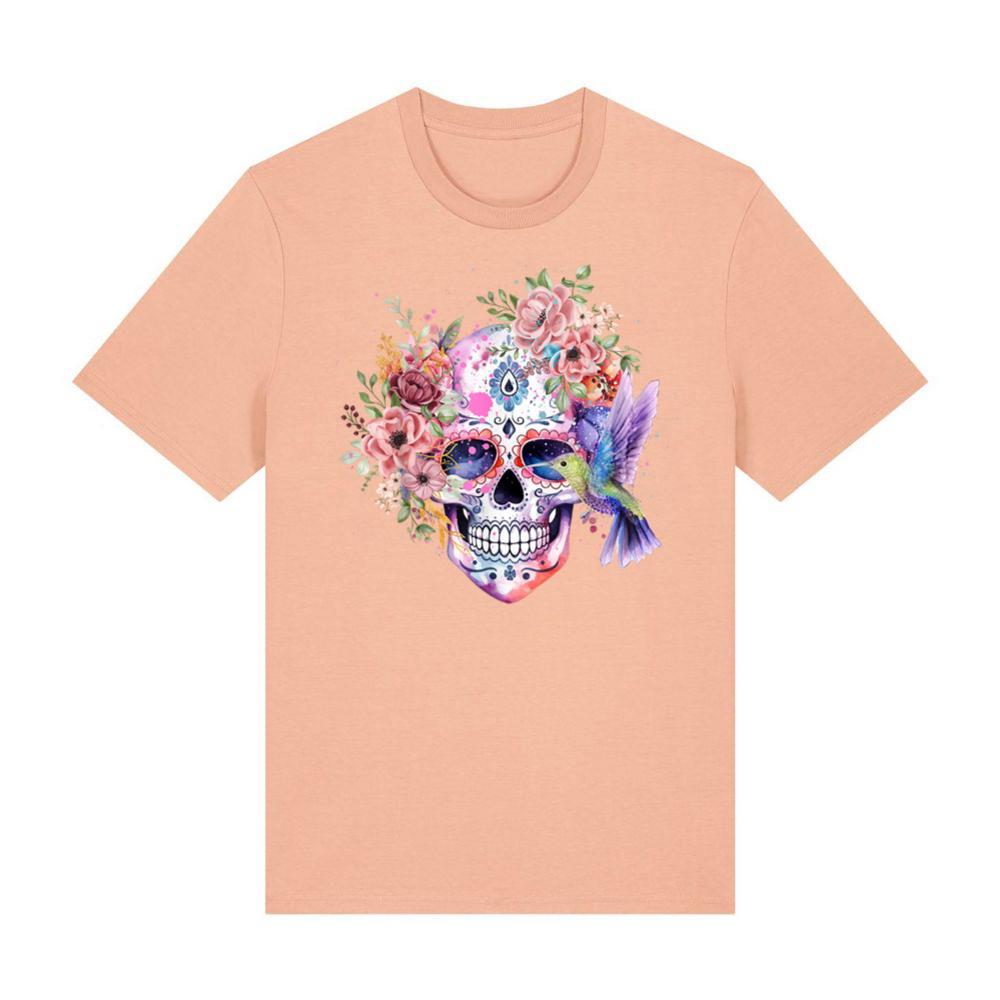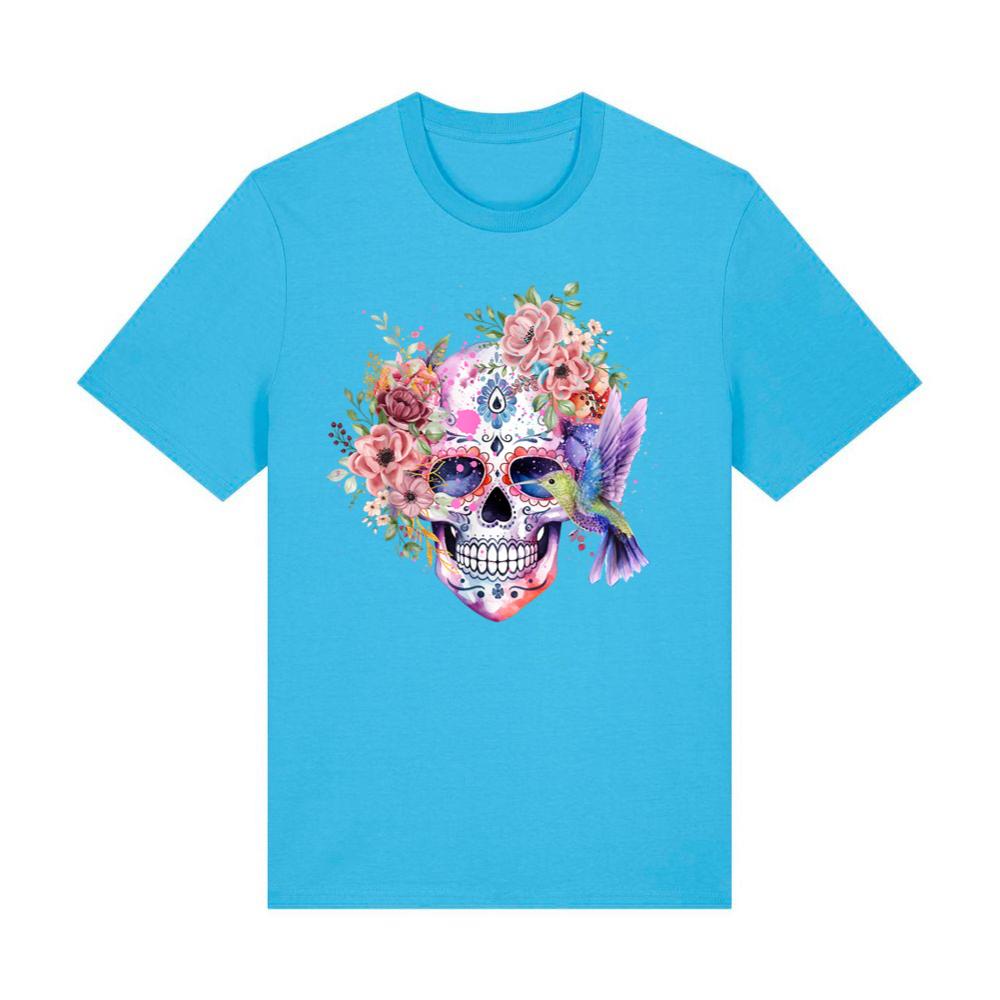 Sugar Skull Retro Flower with Hummingbird Halloween Gothic T-Shirt